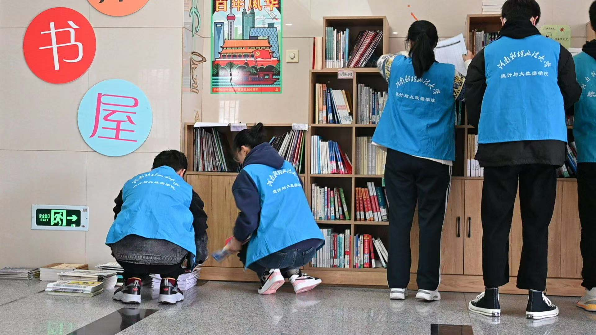 早上九点,志愿者们准时到达鸟巢书屋,穿上分发好的志愿者服装,在了解了工作任务分配之后,志愿者们有序地展开了活动。活动分为三组,第一组进行鸟巢书屋的打扫,第二组进行图书的整理和编号,第三组负责张贴志愿者们绘制的宣传标语。现场井然有序,志愿者们互帮互助使鸟巢书屋焕然一新,变得更加整洁美观。