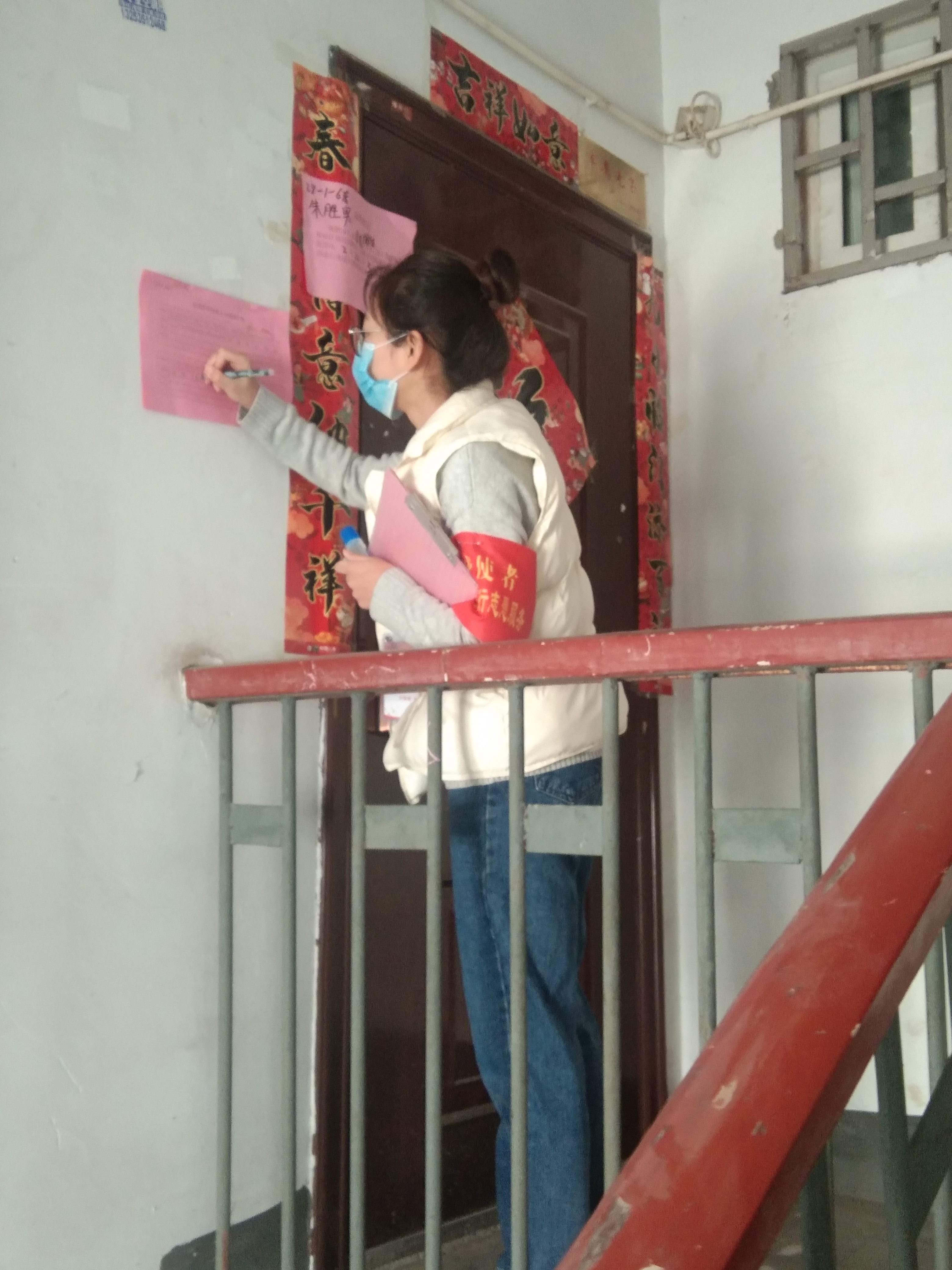 虽然没有专业的医疗知识,不能奔赴医疗前线,但是她仍在后方为疫情的防控贡献出自己的一份力量,积极响应社会号召。她主动申请加入了社区疫情防控志愿者队伍,帮助工作人员测量出入社区人员的体温;每天查看各楼层封条情况,以及记录隔离人员的体温。网课学习开始后,志愿活动也没有落下,心系社会的她学习之余继续为社会出力、为疫情早日结束献力。