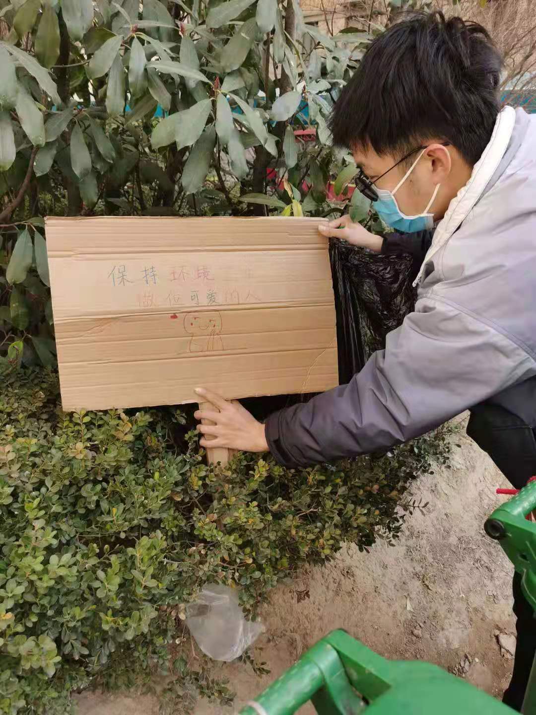 1月30日,201106班李林阳、201107班可雨莹两人在漯河市沙澧河风景区开展捡拾和分类垃圾的活动,两名组员在实践的过程中也发现了有些游客环保意识淡薄、对垃圾分类界限不清晰等问题。2月4日,191105班何诗敏在洛阳市自行开展了修剪、浇灌绿植盆栽的活动,细心剪掉已经坏死枯萎的枝条,认真浇灌缺水干枯的绿植,让花草树木能够更好的生长。为了更好的宣传与倡导绿色理念,2月5日上午,191105班闫朝相利用废纸箱手工制作环保标语,并将标语放置在小区垃圾桶等显著位置周围,后经实践观察,设置环保标语后居民的垃圾清理与分类意识有所提高。