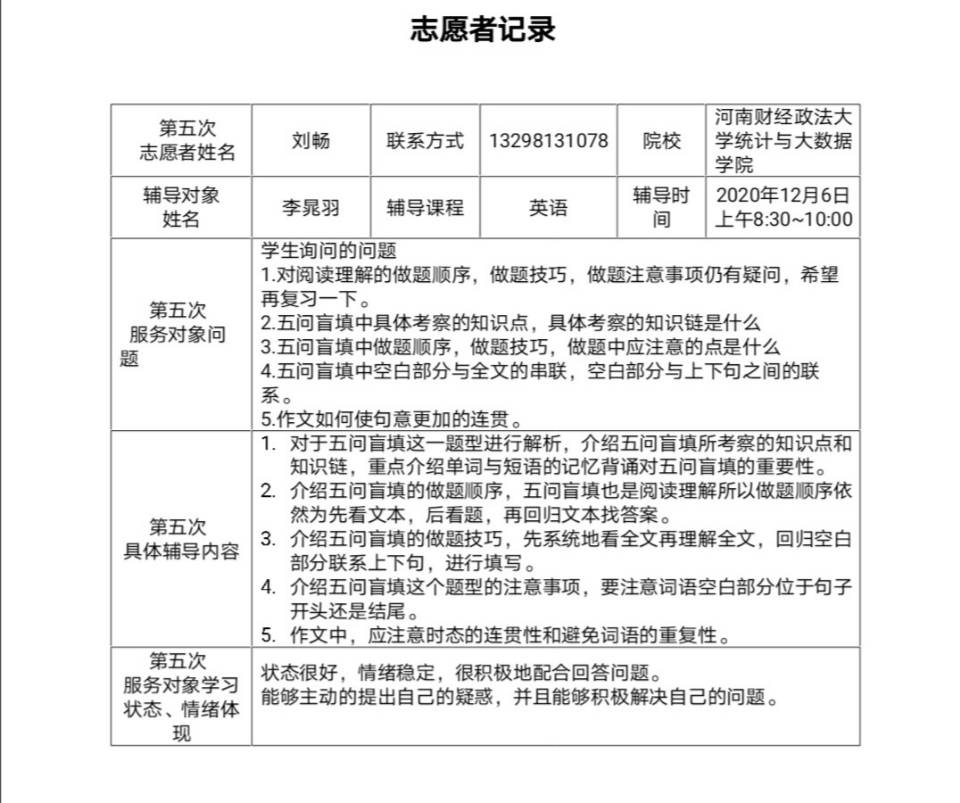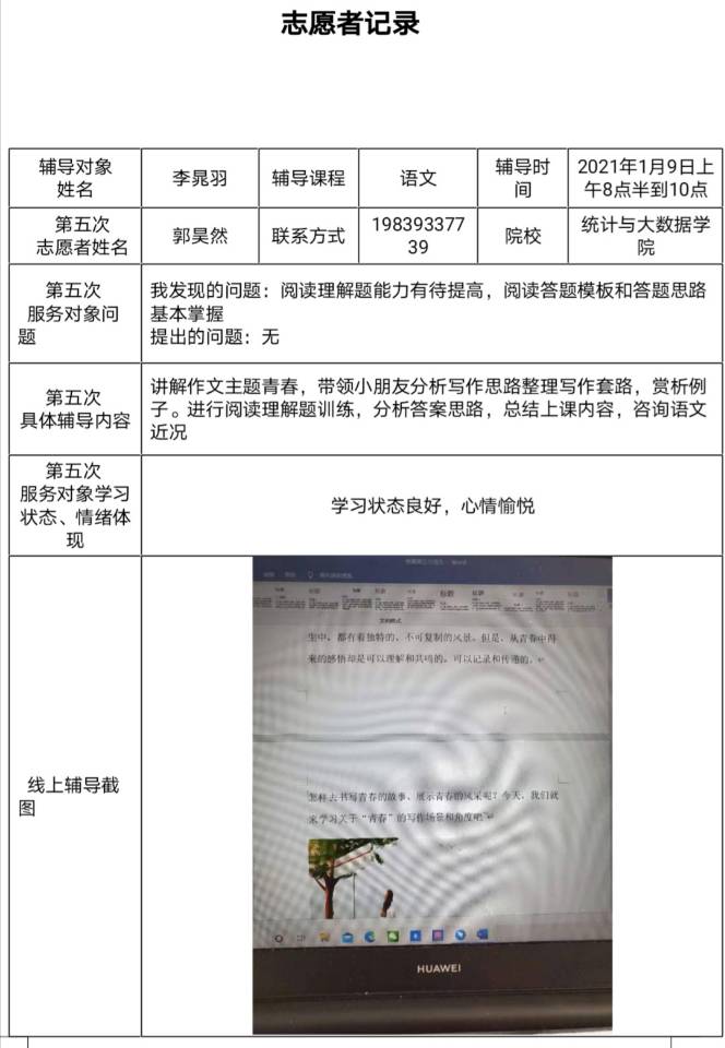 志愿者们进行辅导活动之前会与帮扶孩子的监护人进行线上交流沟通,了解了孩子的基本情况和功课需求之后有针对性的线上辅导,在有限时间内尽己所能教给他们更多新的知识。201102班刘畅同学和2011106班郭昊然同学分别负责困境儿童的英语和语文科目,两位志愿者每周认真提前制作PPT进行备课,并于周六和周日上午进行一个半小时的线上辅导。在与辅导对象教学过程中耐心的解答他们的问题,教授新的知识、新的思维方式,不仅仅局限于课堂,还将快乐、乐观的精神带给孩子。通过成员们不懈的努力,该困境儿童收获颇丰,不仅纠正了学习上的误区,而且期末成绩有显著提高。