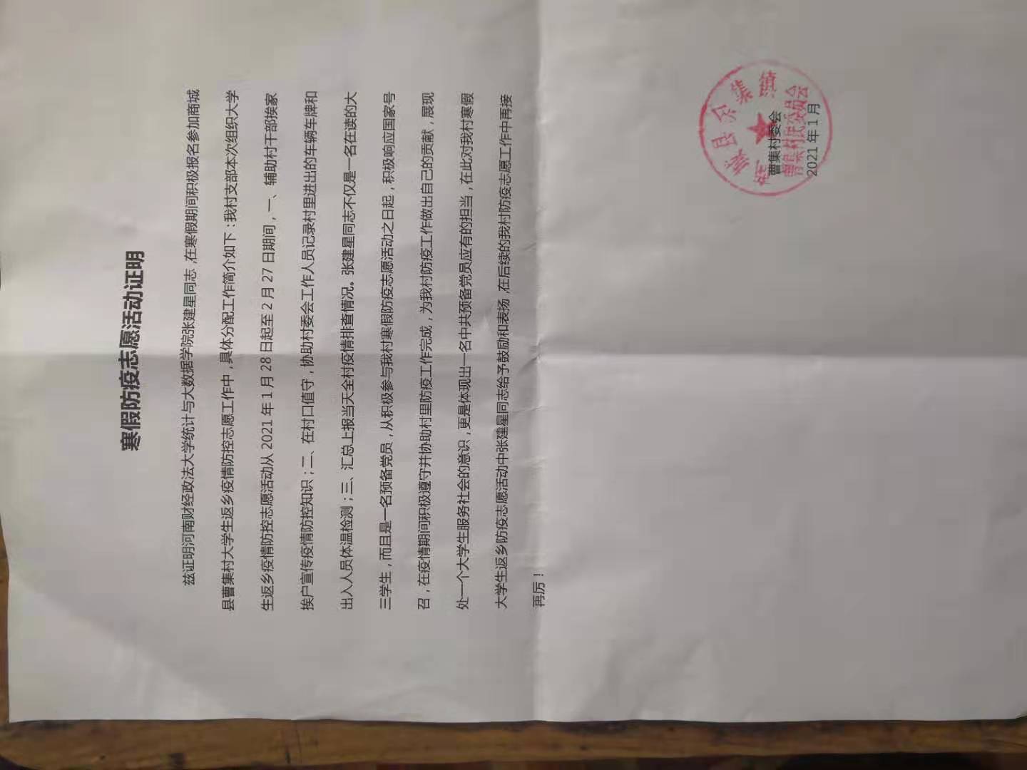 为响应号召,积极参与疫情防护志愿工作,充分发挥青年生力军和突击队的作用,公司大三员工张建星利用寒假时间,主动加入了自己的家乡——信阳市商城县余集镇曹集村的肺炎疫情防控工作。