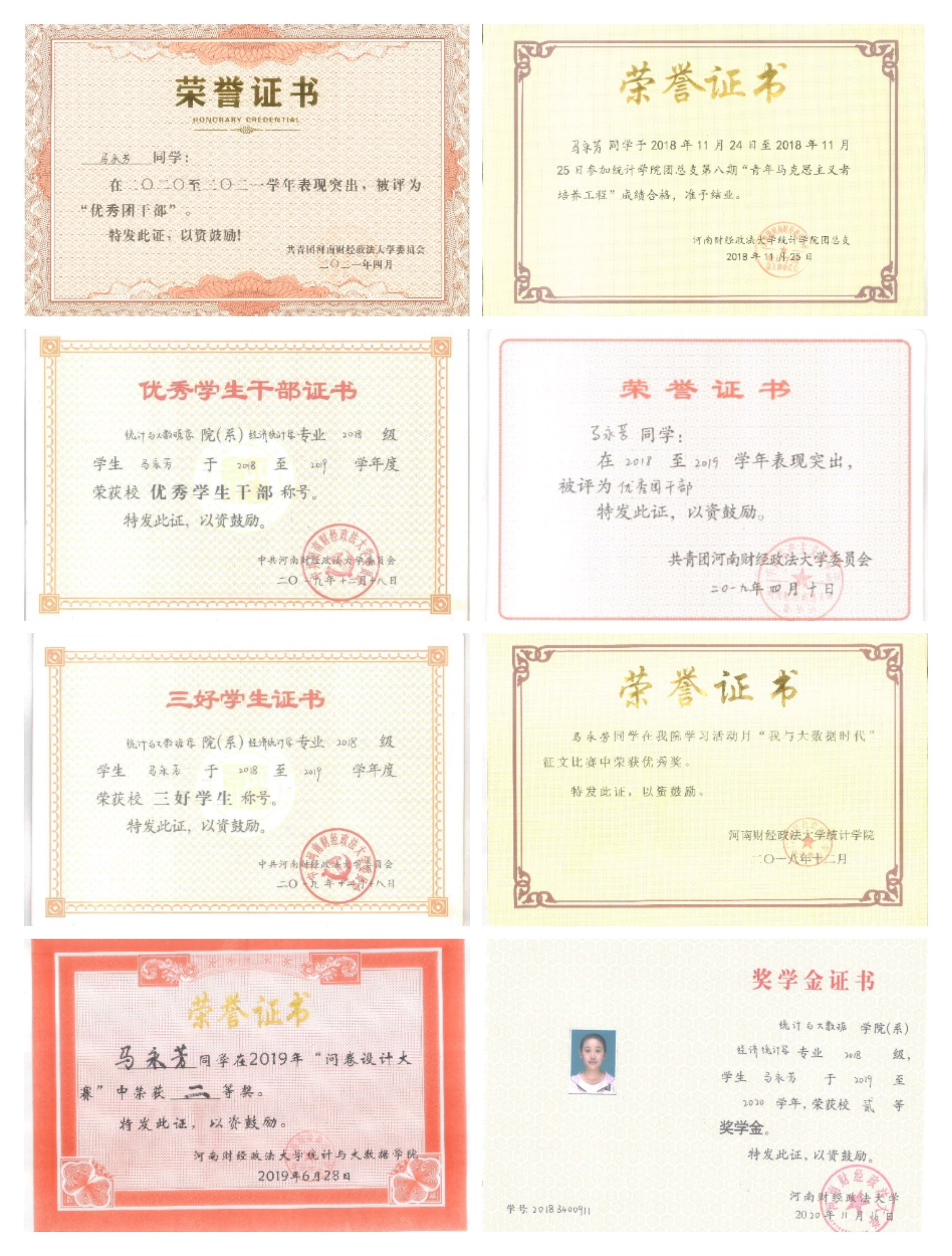 “纸上得来终觉浅,绝知此事要躬行”。学习任何一样东西都需要理论和实践相结合。马永芳从大一开始考取证书,大二上学期便成功考取了英语四、六级、计算机二级和普通话证书。在基础的证书拿到手后,她便开启了自己的竞赛之旅。